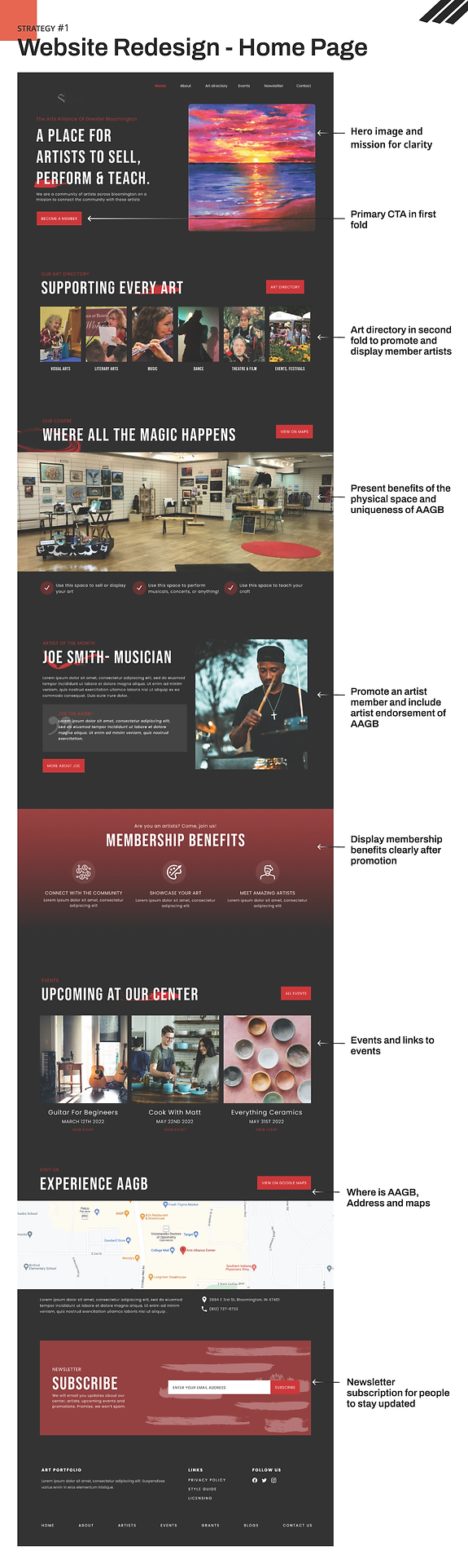 We proposed the following website design to better meet the needs of the AAGB's target audience. The callouts to the right indicate specific design opportunities which we utilize to better effect with the improved design.